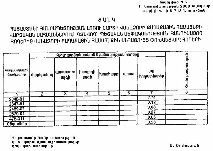 6. Թույլատրել Հայաստանի Հանրապետության կառավարությանն առընթեր անշարժ գույքի կադաստրի պետական կոմիտեի նախագահին Հայաստանի Հանրապետության պետական գեոդեզիական ցանցի հավասարակշռման արդյունքների հիման վրա Հայաստանի Հանրապետության վարչատարածքային միավորների սահմանանիշերի կոորդինատների ժողովածուի հրատարակումից հետո հողային ֆոնդի ընթացիկ հաշվառման ժամանակ Հայաստանի Հանրապետության Լոռու մարզի Վանաձորի քաղաքային համայնքի հողային հաշվեկշռում սահմանված կարգով կատարել համապատասխան փոփոխություններ: