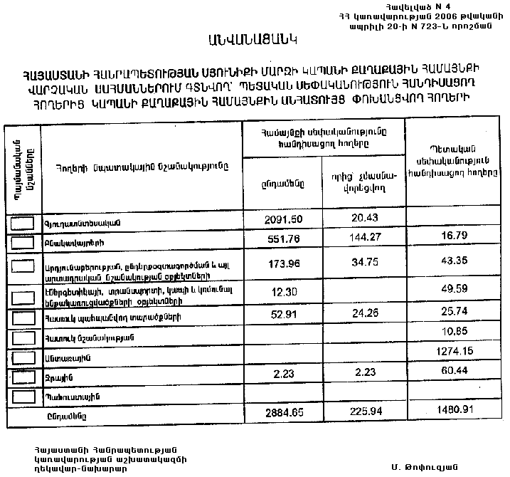 4. Ընդունել ի գիտություն Հայաստանի Հանրապետության Սյունիքի մարզի Կապանի քաղաքային համայնքի հողային ֆոնդի առկայության և բաշխման մասին հաշվետվությունը` 2005 թվականի հունվարի 1-ի դրությամբ` համաձայն NN 8 և 9 հավելվածների: