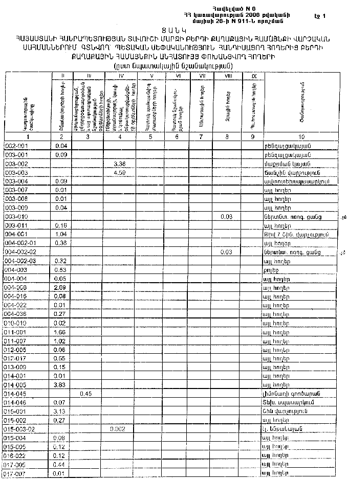 6. Թույլատրել Հայաստանի Հանրապետության կառավարությանն առընթեր անշարժ գույքի կադաստրի պետական կոմիտեի նախագահին Հայաստանի Հանրապետության պետական գեոդեզիական ցանցի հավասարակշռման արդյունքների հիման վրա Հայաստանի Հանրապետության վարչատարածքային միավորների սահմանանիշերի կոորդինատների ժողովածուի հրատարակումից հետո հողային ֆոնդի ընթացիկ հաշվառման ժամանակ Հայաստանի Հանրապետության Տավուշի մարզի Բերդի քաղաքային համայնքի հողային հաշվեկշռում սահմանված կարգով կատարել համապատասխան փոփոխություններ: