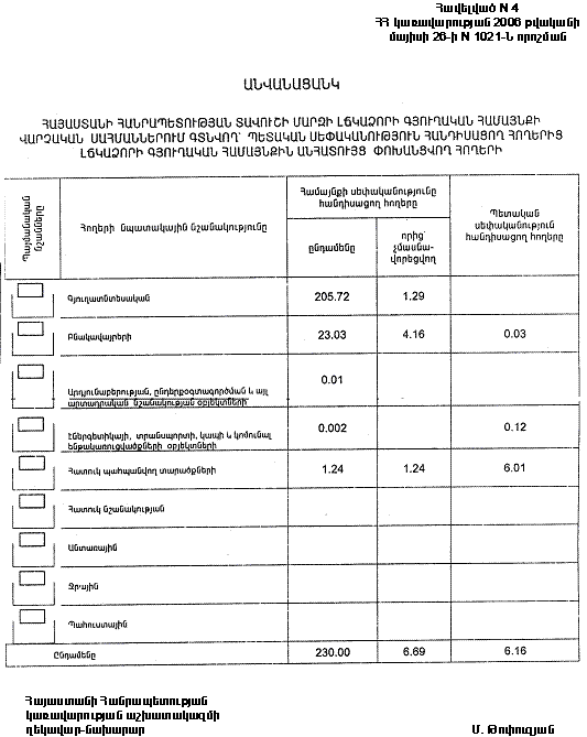 ա) Հայաստանի Հանրապետության Տավուշի մարզի Լճկաձորի գյուղական համայնքին անհատույց սեփականության իրավունքով փոխանցվող 230.0 հեկտար հողերից 6.69 հեկտարը մասնավորեցման ենթակա չէ.