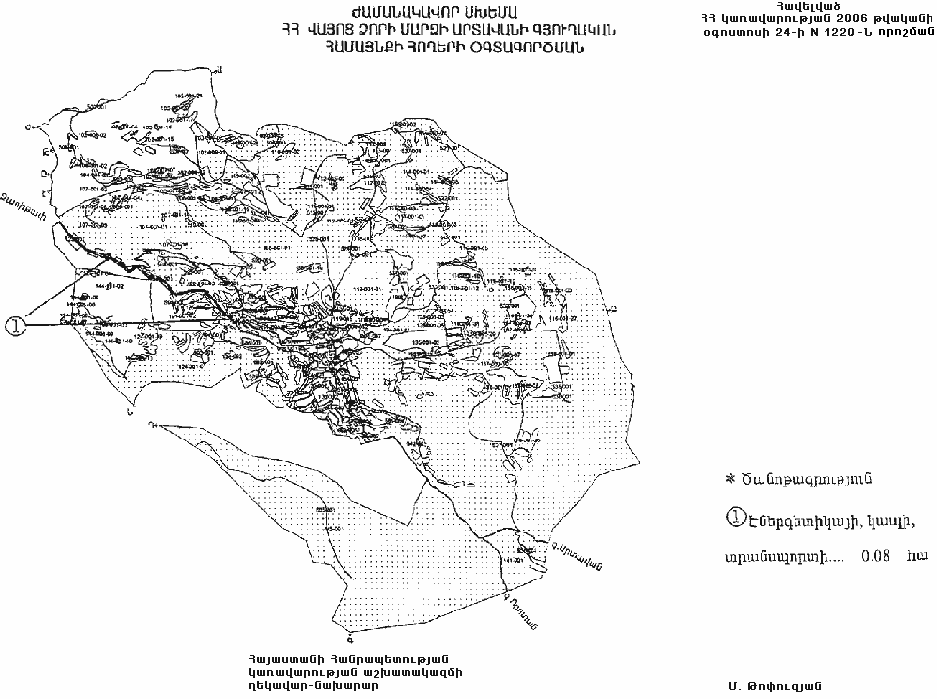 1. Հայաստանի Հանրապետության կառավարության 2002 թվականի մայիսի 30-ի N 703-Ն որոշմամբ հաստատված` Հայաստանի Հանրապետության Վայոց ձորի մարզի Արտավանի գյուղական համայնքի հողերի օգտագործման ժամանակավոր սխեմայում` համաձայն հավելվածի, համայնքային սեփականություն հանդիսացող գյուղատնտեսական նշանակության հողերից 0.08 հեկտար արոտավայրը փոխադրել էներգետիկայի, տրանսպորտի, կապի և կոմունալ ենթակառուցվածքների օբյեկտների հողերի կատեգորիա` հիդրոէլեկտրակայանի և օժանդակ կառույցների շինարարության համար: