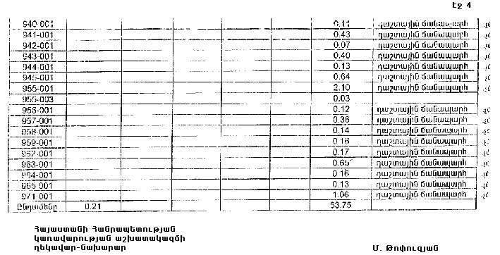 4. Ընդունել ի գիտություն Հայաստանի Հանրապետության Արմավիրի մարզի Փարաքարի գյուղական համայնքի հողային ֆոնդի առկայության և բաշխման մասին հաշվետվությունը՝ 2005 թվականի հունվարի 1-ի դրությամբ՝ համաձայն NN 8 և 9 հավելվածների: