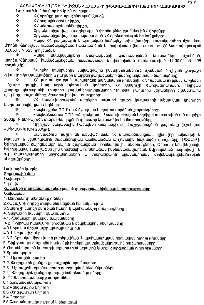 2. Հայաստանի Հանրապետության քաղաքաշինության նախարարին` գլխավոր հատակագծի իրականացման մոնիթորինգն ապահովել համաձայն Հայաստանի Հանրապետության կառավարության 1999 թվականի դեկտեմբերի 31-ի «Պետական քաղաքաշինական կադաստրի վարման և քաղաքաշինական գործունեության մոնիթորինգի անցկացման կարգը հաստատելու մասին» N 802 որոշմամբ սահմանված կարգի: