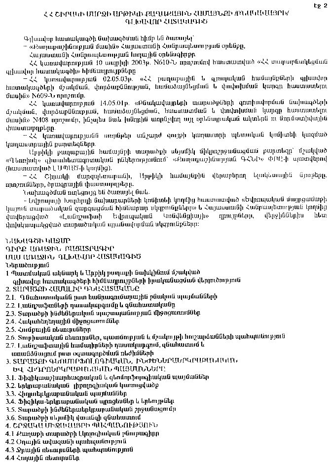 2. Հայաստանի Հանրապետության քաղաքաշինության նախարարին` գլխավոր հատակագծի իրականացման մոնիթորինգն ապահովել համաձայն Հայաստանի Հանրապետության կառավարության 1999 թվականի դեկտեմբերի 31-ի «Պետական քաղաքաշինական կադաստրի վարման և քաղաքաշինական գործունեության մոնիթորինգի անցկացման կարգը հաստատելու մասին» N 802 որոշմամբ սահմանված կարգի: