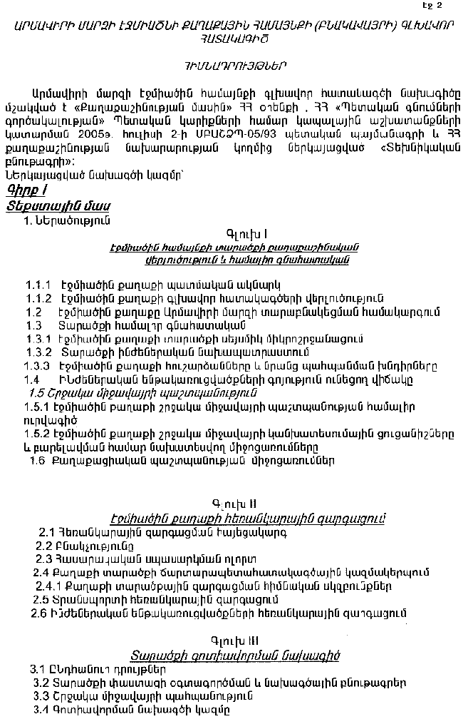 2. Հայաստանի Հանրապետության քաղաքաշինության նախարարին` գլխավոր հատակագծի իրականացման մոնիթորինգն ապահովել համաձայն Հայաստանի Հանրապետության կառավարության 1999 թվականի դեկտեմբերի 31-ի «Պետական քաղաքաշինական կադաստրի վարման և քաղաքաշինական գործունեության մոնիթորինգի անցկացման կարգը հաստատելու մասին» N 802 որոշմամբ սահմանված կարգի: