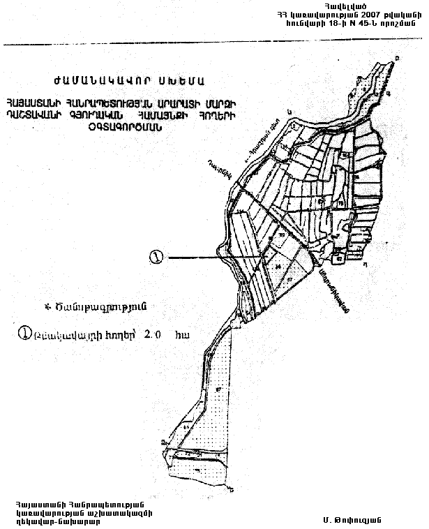 Հայաստանի Հանրապետության կառավարության 2001 թվականի օգոստոսի 6-ի N 710 որոշմամբ հաստատված` Հայաստանի Հանրապետության Արարատի մարզի Դաշտավանի գյուղական համայնքի հողերի օգտագործման ժամանակավոր սխեմայում` համաձայն հավելվածի, համայնքային սեփականություն հանդիսացող գյուղատնտեսական նշանակության հողերից 2 հեկտար վարելահողը փոխադրել բնակավայրերի հողերի կատեգորիա` բնակելի կառուցապատման համար: