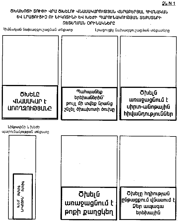 «17. Ծխելու վնասակարության վերաբերյալ հիմնական նախազգուշացման տեքստը պետք է զետեղվի ցանկացած տուփի 2 առավել մեծ մակերեսով կողմերից մեկի վրա, իսկ լրացուցիչ նախազգուշացման տեքստը` մյուսի վրա: Նախազգուշացման տեքստերը պետք է ներառվեն սև գույնի շրջանակի մեջ և զբաղեցնեն ծխախոտային արտադրատեսակների մեծածախ ու մանրածախ առևտրում օգտագործվող սպառողական փաթեթի (ծխախոտի տուփի և բոքսի) 2 առավել մեծ կողմերից յուրաքանչյուրի մակերևույթի 30 տոկոսից ոչ պակաս մակերեսը, ներառյալ շրջանակը, և համապատասխանեն սույն տեխնիկական կանոնակարգում տրված օրինակներին (NN 1 և 2 ձևեր) և հետևյալ պահանջներին`