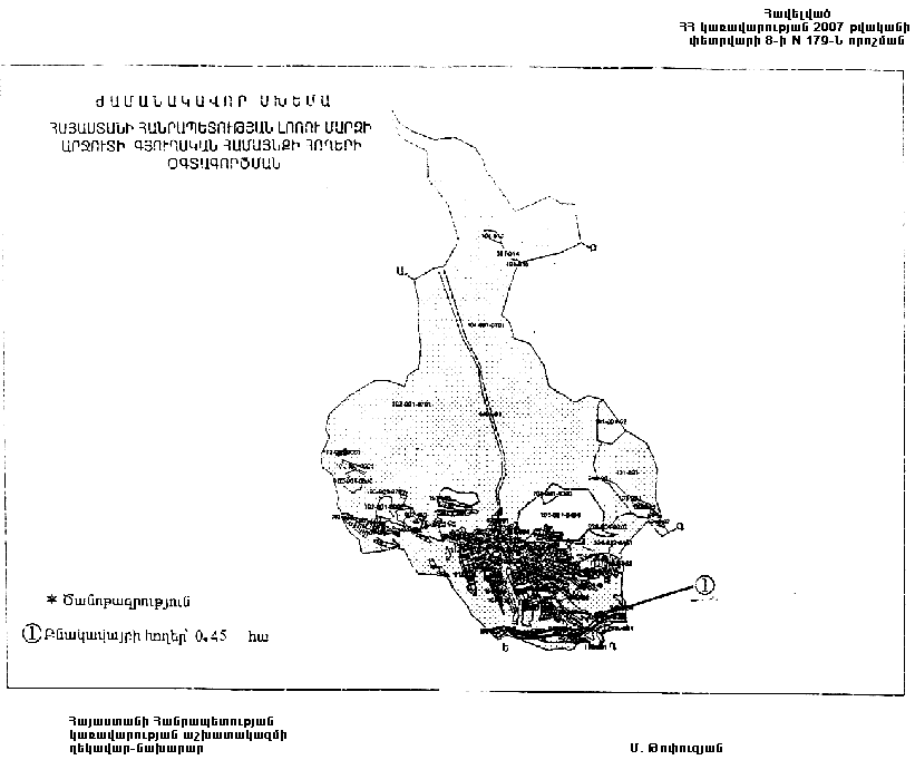 Հայաստանի Հանրապետության կառավարության 2002 թվականի օգոստոսի 1-ի N 1125-Ն որոշմամբ հաստատված` Հայաստանի Հանրապետության Լոռու մարզի Արջուտի գյուղական համայնքի հողերի օգտագործման ժամանակավոր սխեմայում` համաձայն հավելվածի, համայնքային սեփականություն հանդիսացող գյուղատնտեսական նշանակության հողերից 0.45 հեկտար արոտավայրերը փոխադրել բնակավայրերի հողերի կատեգորիա` հասարակական կառուցապատման համար: