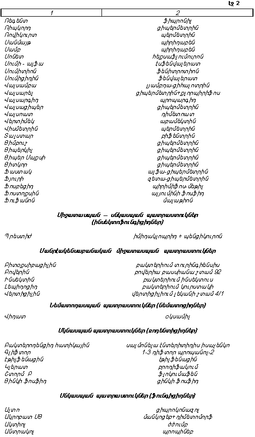 2. Գյուղատնտեսության ճյուղերի զարգացման վարչությանը (Գ. Պետրոսյան)` 10-օրյա ժամկետում «Հայաստանի Հանրապետությունում օգտագործման համար թույլատրված բույսերի պաշտպանության քիմիական և կենսաբանական միջոցների անվանացանկ»-ի լրամշակված տարբերակը, համաձայն «Իրավական ակտերի մասին» Հայաստանի Հանրապետության օրենքի` ներկայացնել ՀՀ արդարադատության նախարարություն` պետական գրանցման: