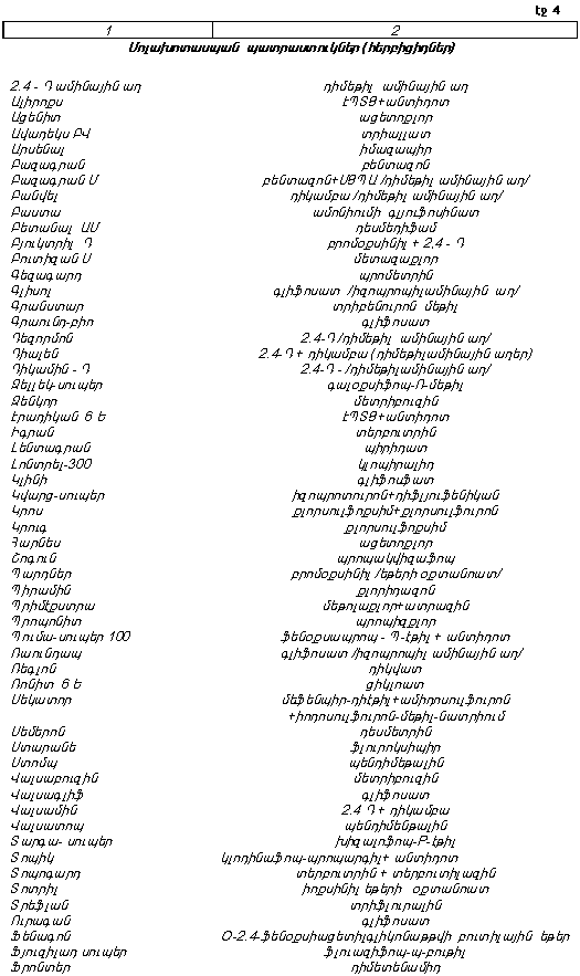 Ղեկավարվելով ՀՀ կառավարության 2002 թ. հունվարի 8-ի N 12 որոշմամբ հաստատված կարգի 13-րդ կետի դրույթներով և հիմք ընդունելով բույսերի պաշտպանության քիմիական, կենսաբանական միջոցների և կենսաբանական ակտիվ նյութերի գրանցման միջգերատեսչական հանձնաժողովի 2002թ. ապրիլի 11-ի և 2003 թ. օգոստոսի 26-ի նիստերում ընդունված եզրակացությունները