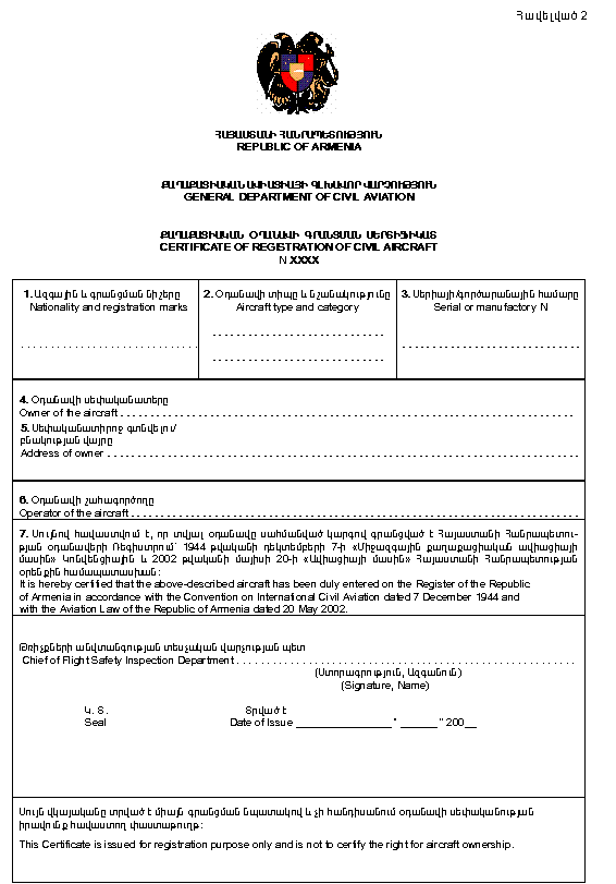 բ) օդանավի Գրանցման Սերտիֆիկատի (Հավելված 2),