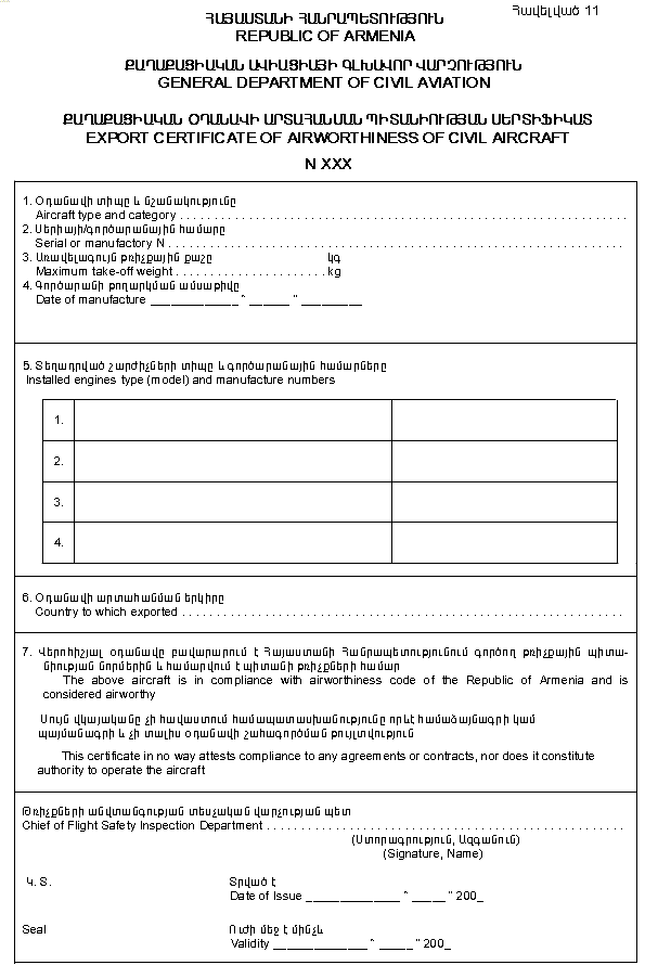 59. Օդանավի Արտահանման Պիտանիության Սերտիֆիկատում գրանցվում է նշանակման պետությունը և գործողության ժամկետը: