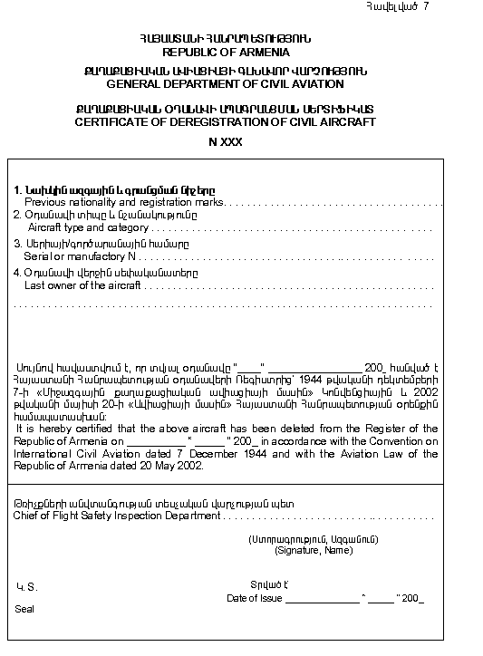 58. Հայաստանի Հանրապետության օդանավերի ռեգիստրից օդանավի դուրսգրման և օտարերկրյա պետություն արտահանման դեպքում, սեփականատիրոջ հայտի (Հավելված 9) և Գլխավոր Վարչություն վերադարձված օդանավի Գրանցման Սերտիֆիկատի և օդանավի թռիչքային Պիտանիության Սերտիֆիկատի հիման վրա, փոխարենը տրվում է օդանավի ապագրանցման Սերտիֆիկատ (Հավելված 7) և օդանավի Արտահանման Պիտանիության Սերտիֆիկատ (Հավելված 11):