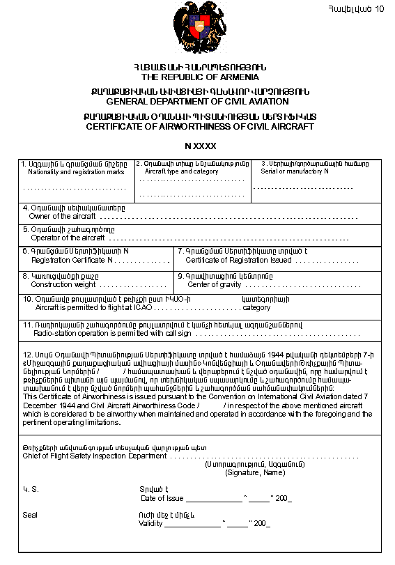 9. Հայաստանի Հանրապետությունում ավիացիոն նպատակներով շահագործվող օդանավը պետք է ունենա օդանավի Գրանցման Սերտիֆիկատ կամ գրանցման ժամանակավոր Սերտիֆիկատ: