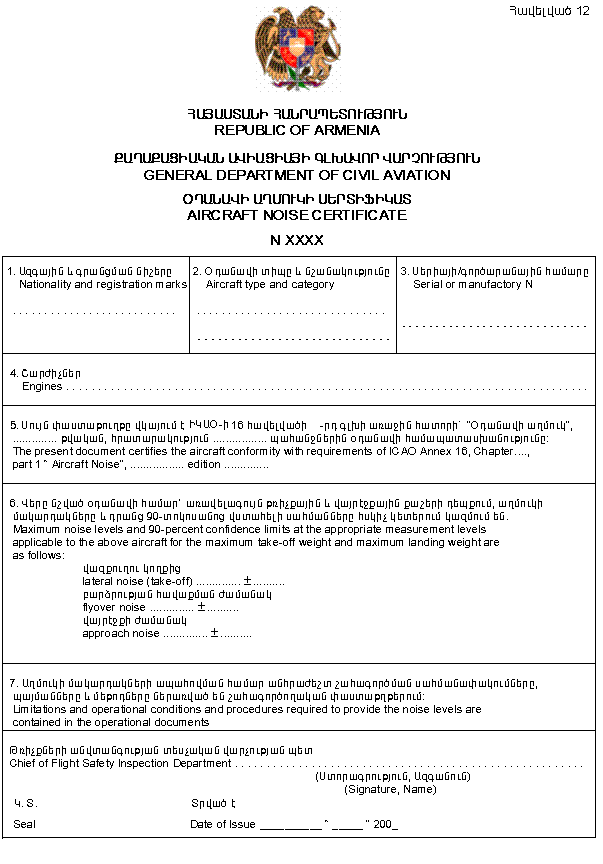 50. Աղմուկի Սերտիֆիկատը (Հավելված 12) տրվում է Գլխավոր Վարչության կողմից սեփականատիրոջ կամ շահագործողի հայտի և տեղանքում ըստ Աղմուկի Օդանավի Տեսակի Հավաստագրի հիման վրա: