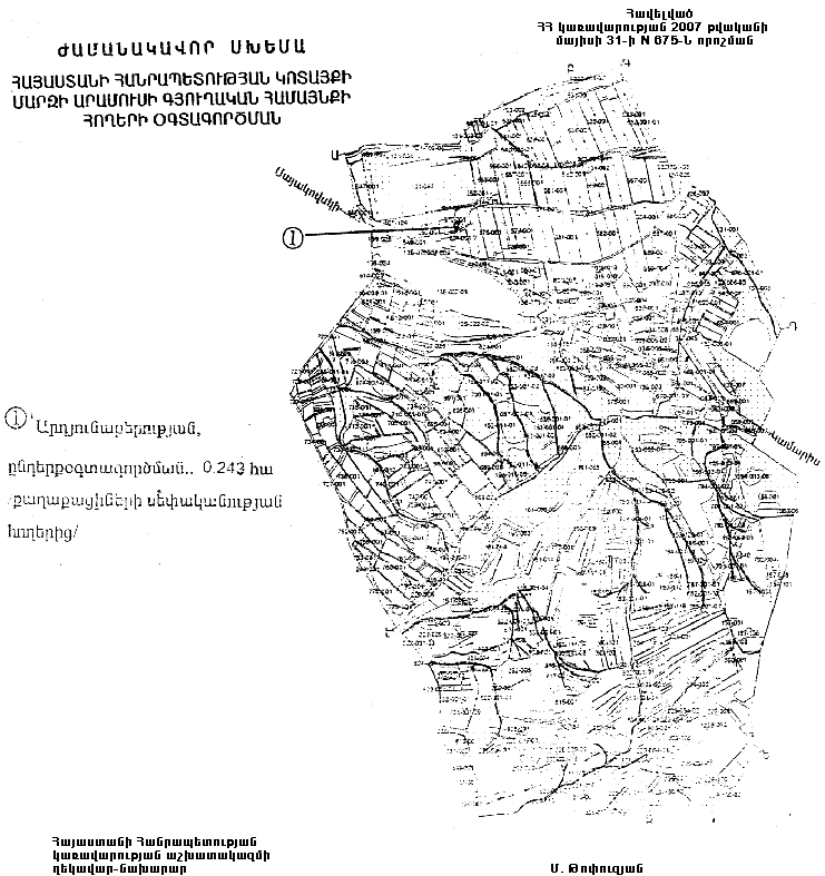 1. Հայաստանի Հանրապետության կառավարության 2003 թվականի հոկտեմբերի 2-ի N 1239-Ն որոշմամբ հաստատված` Հայաստանի Հանրապետության Կոտայքի մարզի Արամուսի գյուղական համայնքի հողերի օգտագործման ժամանակավոր սխեմայում` համաձայն հավելվածի, քաղաքացիների սեփականությունը հանդիսացող գյուղատնտեսական նշանակության հողերից 0.243 հեկտար վարելահողը փոխադրել արդյունաբերության, ընդերքօգտագործման և այլ արտադրական նշանակության օբյեկտների հողերի կատեգորիա` գյուղատնտեսական արտադրական օբյեկտների կառուցման համար: