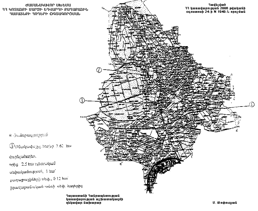 Հայաստանի Հանրապետության կառավարության 2002 թվականի օգոստոսի 29-ի N 1350-Ն որոշմամբ հաստատված` Հայաստանի Հանրապետության Կոտայքի մարզի Եղվարդի քաղաքային համայնքի հողերի օգտագործման ժամանակավոր սխեմայում` համաձայն հավելվածի պետական սեփականություն հանդիսացող` գյուղատնտեսական նշանակության հողերից 2.5 հեկտարը, քաղաքացիների սեփականությունը հանդիսացող` գյուղատնտեսական նշանակության հողերից մեկ հեկտարը և իրավաբանական անձանց սեփականությունը հանդիսացող 0.12 հեկտար վարելահողը փոխադրել բնակավայրերի հողերի կատեգորիա, այդ թվում` 0.12 հեկտարը` հասարակական կառուցապատման համար։