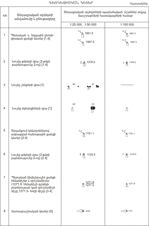 14. (1, 2, 5-7) Պետական և Ազգային գեոդեզիական ցանցի կետերի պայմանական նշանները ուղեկցվում են կետի կենտրոնի վերին նիշի գրությամբ, իսկ նիվելիրային դրոշմանիշների և հենանիշների պայմանական նշանները՝ 0,1մ ճշտությամբ հենանիշի գլխիկի բարձունքային նիշի կամ դրոշմանիշի կենտրոնի բարձունքային նիշի գրությամբ: 1:25 000 մասշտաբի քարտեզների վրա ռելիեֆի 2.5 մ անկման և վերին կենտրոնի (հենանիշի գլխիկի կամ դրոշմանիշի կենտրոնի) ու հողի մակերևույթի նիշերի 0.2 մ և ավելի տարբերության դեպքում գեոդեզիական կետերի նիշերը տրվում են կոտորակի տեսքով, որոնց համարիչում նշվում է վերին կենտրոնի (հենանիշի գլխիկի կամ դրոշմանիշի կենտրոնի) նիշը, իսկ հայտարարում` հողի մակերևույթի նիշը: