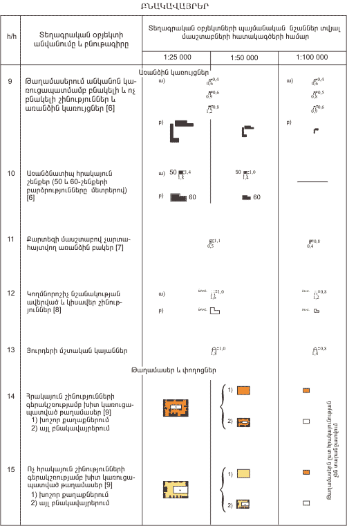 1:100 000 մասշտաբի քարտեզի վրա թաղամասերի կառուցապատ մասերը ցույց են տրվում 0.5 մմ լայնությամբ լցված շերտով` կառուցապատման մեջ բնորոշ անջրպետների արտահայտմամբ: Փողոցների կամ կառուցապատման մեջ անջրպետների պատկերների միջև լցված շերտերի երկարությունները չպետք է գերազանցեն 5 մմ-ը: