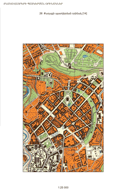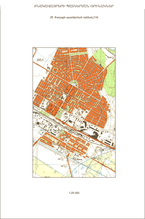 1:25 000 մասշտաբի քարտեզների վրա խիտ կառուցապատված թաղամասերը պատկերելիս գունավոր ֆոնի վրա, որպես կանոն, տրվում են բոլոր շենքերը: Թաղամասերի ներսում կարող են անտեսվել աննշան շինությունները: Պատկերվում են քարտեզի մասշտաբով տների միջև 0.3 մմ և ավելի լայնությամբ բոլոր արանքները, իսկ անհրաժեշտության դեպքում նաև ավելի փոքր լայնությամբ արանքները, այդ դեպքում բնօրինակի վրա դրանք ցույց են տրվում 0.3 մմ չափով: