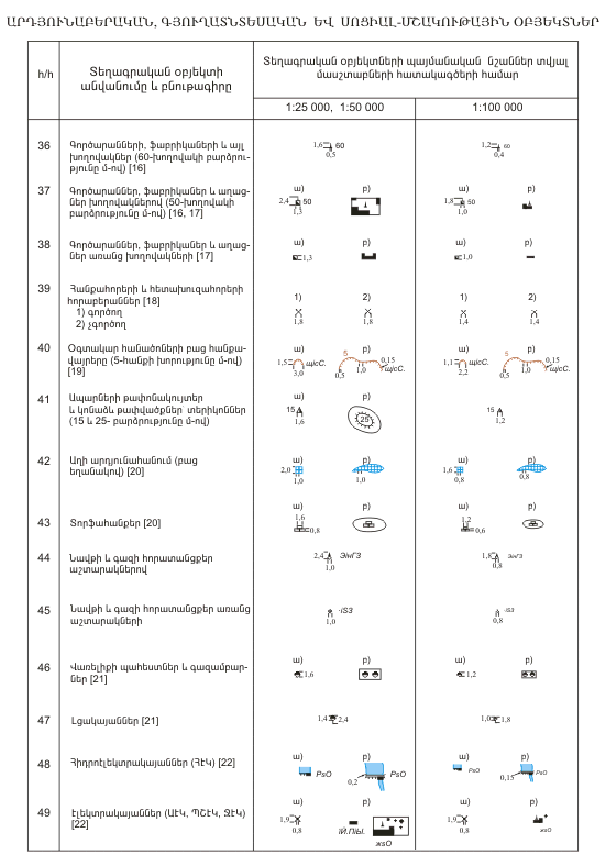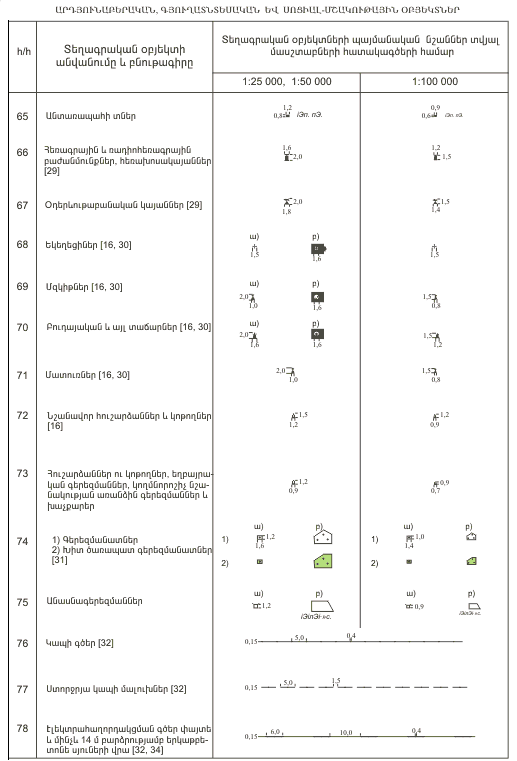 Տեղանքի այնպիսի օբյեկտները, ինչպիսիք են գործարանային խողովակները (36), գործարանները, խողովակներով ֆաբրիկաները և ալրաղացները (37), հեռուստաաշտարակները (53), հեռուստատեսային, ռադիո և ռադիոռելեային կայմերը (54), աշտարակակերպ կապիտալ շինությունները (57) և գեոդեզիական կետեր հանդիսացող այլ նմանատիպ օբյեկտները քարտեզների վրա հատուկ նշաններով չեն առանձնացվում:
