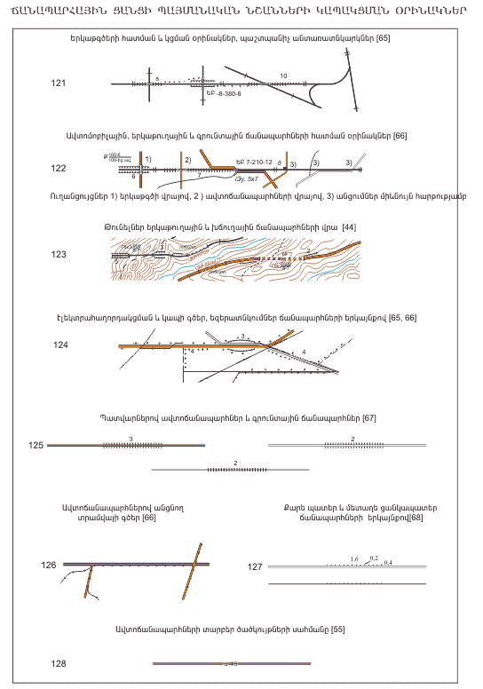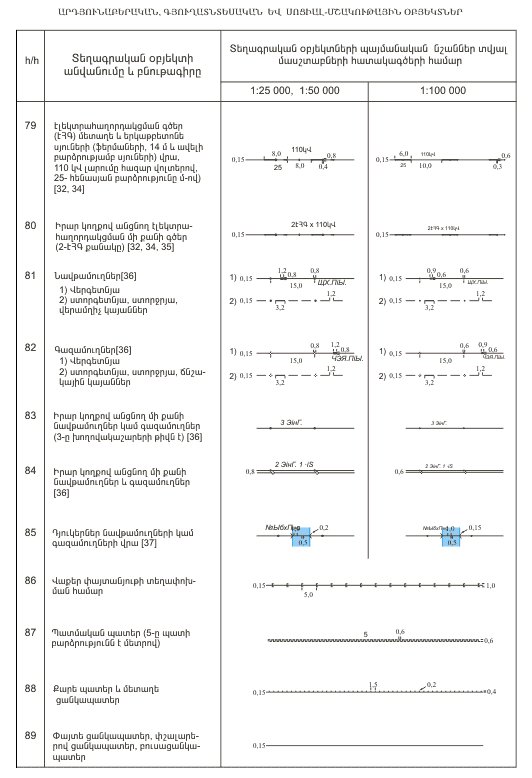 22. (21, 22, 104, 118) Թունելային և էստակադային ուղանցույցները ցույց են տրվում 1:25 000 մասշտաբի քարտեզների վրա, եթե փողոցի լայնությունն արտահայտվում է քարտեզի մասշտաբով (0.8մմ-ից ավելի): Փողոցների, երկաթուղիների և ավտոմոբիլային ճանապարհների ստորգետնյա անցումները ցույց են տրվում 1:25 000 և 1:50 000 մասշտաբի քարտեզների վրա: