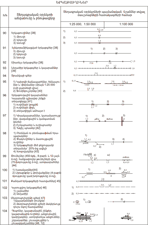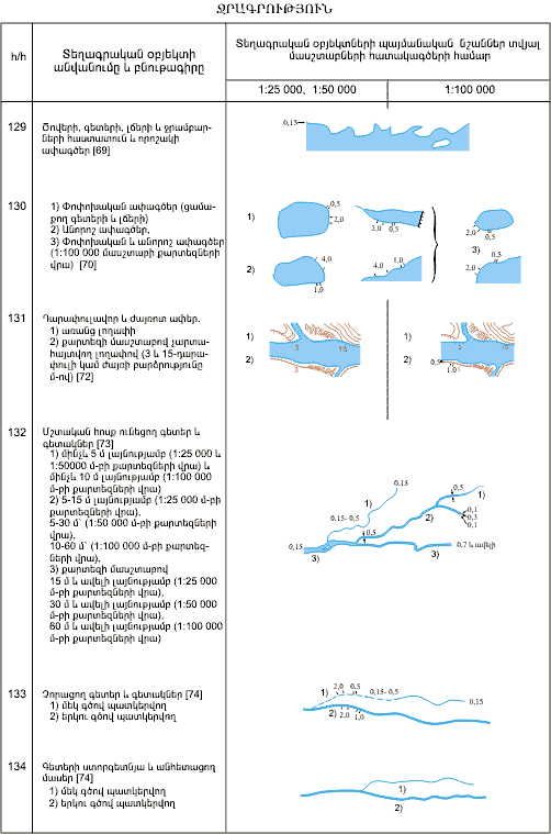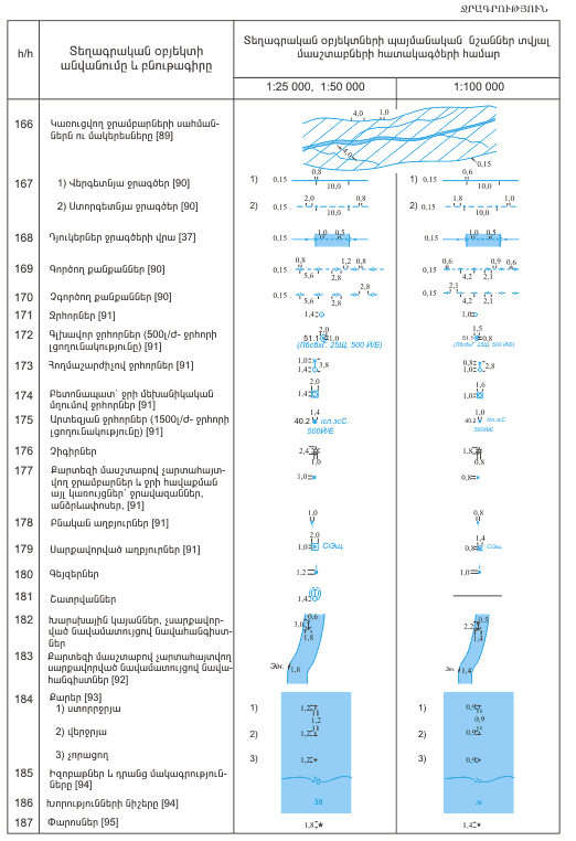 100. (167, 169, 170) Ջրագծերը (վերգետնյա և ստորգետնյա) պատկերվում են քարտեզի մասշտաբով 1 սմ և ավելի երկարության դեպքում, եթե դրանք անցնում են բնակավայրերից դուրս: