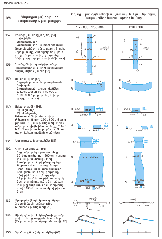 97. (163, 164) 1:25 000 և 1:50 000 մասշտաբի քարտեզների վրա քարտեզի մասշտաբով չարտահայտվող լայնություն ունեցող ջրաթմբերը պատկերվում են լայնակի գծիկներով` երկու գծով: 1:100 000 մասշտաբի քարտեզների վրա բոլոր ջրաթմբերն ու արգելաթմբերը, որոնց լայնությունը քարտեզի մասշտաբով չի արտահայտվում պատկերվում են լայնակի գծիկներով` մեկ գծով: