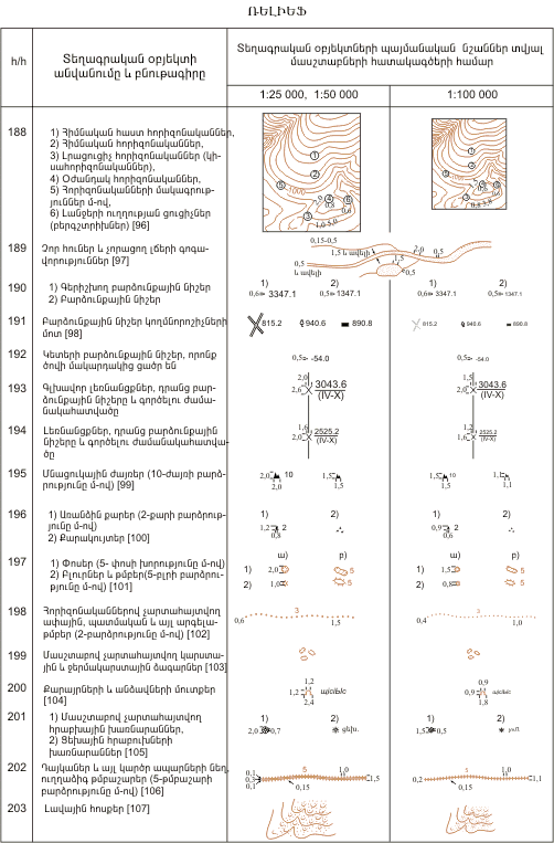 106. (188) Հիմնական, լրացուցիչ (կիսահորիզոնականներ) և օժանդակ հորիզոնականները քարտեզների բնօրինակների վրա անցկացվում են 0.1 մմ հաստությամբ գծերով, հիմնական հաստացված հորիզոնականները` 0.2 մմ հաստությամբ գծերով: Լանջերի ուղղության ցուցիչները (բերգշտրիխները) ցույց են տրվում 0.6 մմ երկարությամբ բարակ գծիկներով: