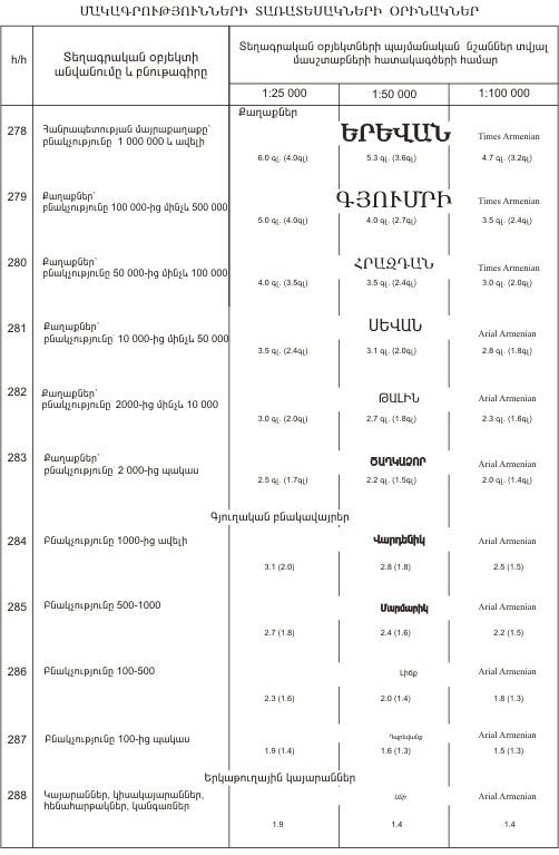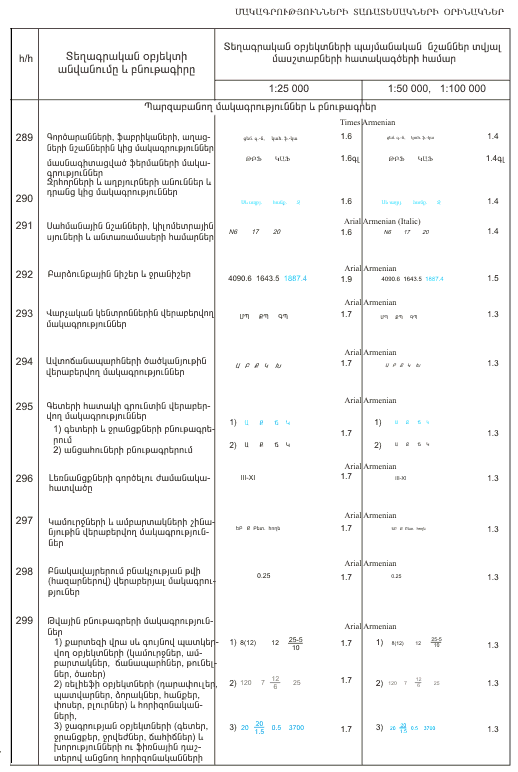 1. Սույն հրահանգում բերված պայմանական նշանները, տառատեսակների օրինակները և պայմանական կրճատումները պարտադիր են 1:25 000, 1:50 000, 1:100 000 մասշտաբի բոլոր տեղագրական քարտեզների համար:
