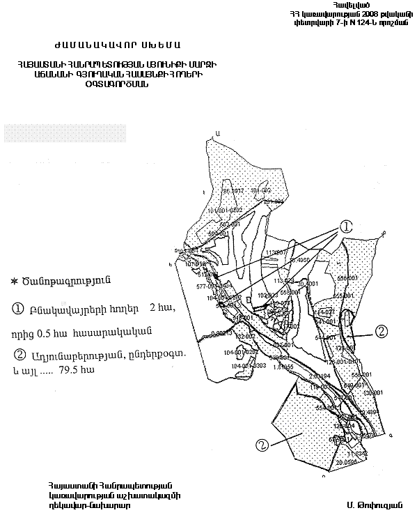 1) 2 հեկտար վարելահողը` բնակավայրերի հողերի կատեգորիա, այդ թվում` 1.5 հեկտարը` բնակելի կառուցապատման, իսկ 0.5 հեկտարը` հասարակական կառուցապատման համար.