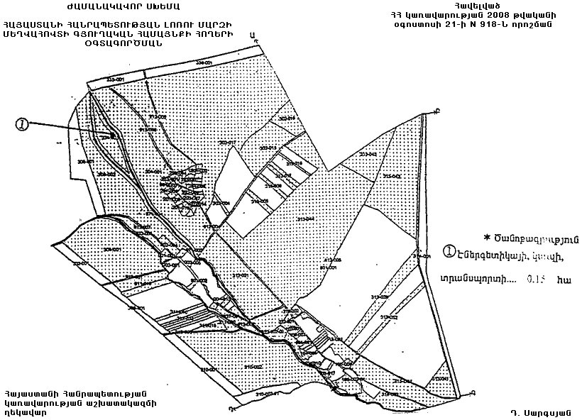 1. Հայաստանի Հանրապետության կառավարության 2004 թվականի հունիսի 3-ի N 799-Ն որոշմամբ հաստատված` Հայաստանի Հանրապետության Լոռու մարզի Մեղվահովտի գյուղական համայնքի հողերի օգտագործման ժամանակավոր սխեմայում` համաձայն հավելվածի, համայնքային սեփականություն հանդիսացող` գյուղատնտեսական նշանակության 0.15 հեկտար արոտավայրը փոխադրել էներգետիկայի, տրանսպորտի, կապի և կոմունալ ենթակառուցվածքների օբյեկտների հողերի կատեգորիա՝ հիդրոէլեկտրակայանի և օժանդակ կառույցների շինարարության համար: