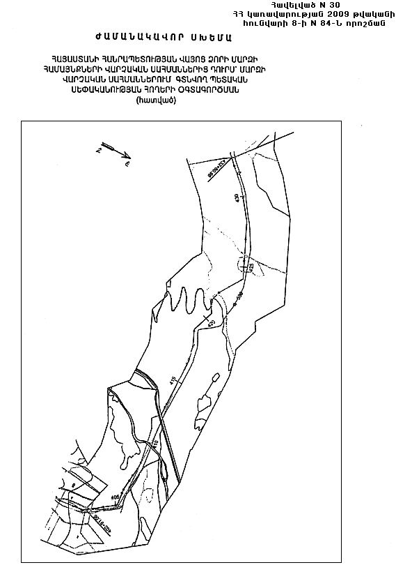30) Վայոց ձորի մարզի համայնքների վարչական սահմաններից դուրս` մարզի վարչական սահմաններում գտնվող` պետական սեփականություն հանդիսացող` գյուղատնտեսական նշանակության հողերից` 4.1309 հեկտարը` համաձայն N 30 հավելվածի, որից` 0.5922 հեկտար խոտհարք և 3.5387 հեկտար