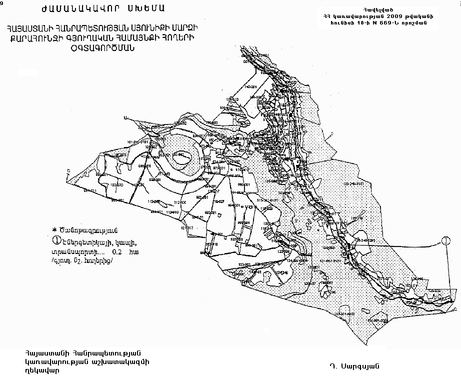 1. Հայաստանի Հանրապետության կառավարության 2008 թվականի հունիսի 19-ի N 629-Ն որոշմամբ հաստատված` Հայաստանի Հանրապետության Սյունիքի մարզի Քարահունջի գյուղական համայնքի հողերի օգտագործման ժամանակավոր սխեմայում` համաձայն հավելվածի, համայնքային սեփականություն հանդիսացող` գյուղատնտեսական նշանակության 0.2 հեկտար այլ հողերը փոխադրել էներգետիկայի, տրանսպորտի, կապի և կոմունալ ենթակառուցվածքների օբյեկտների հողերի կատեգորիա՝ հիդրոէլեկտրակայանի և օժանդակ կառույցների շինարարության համար: