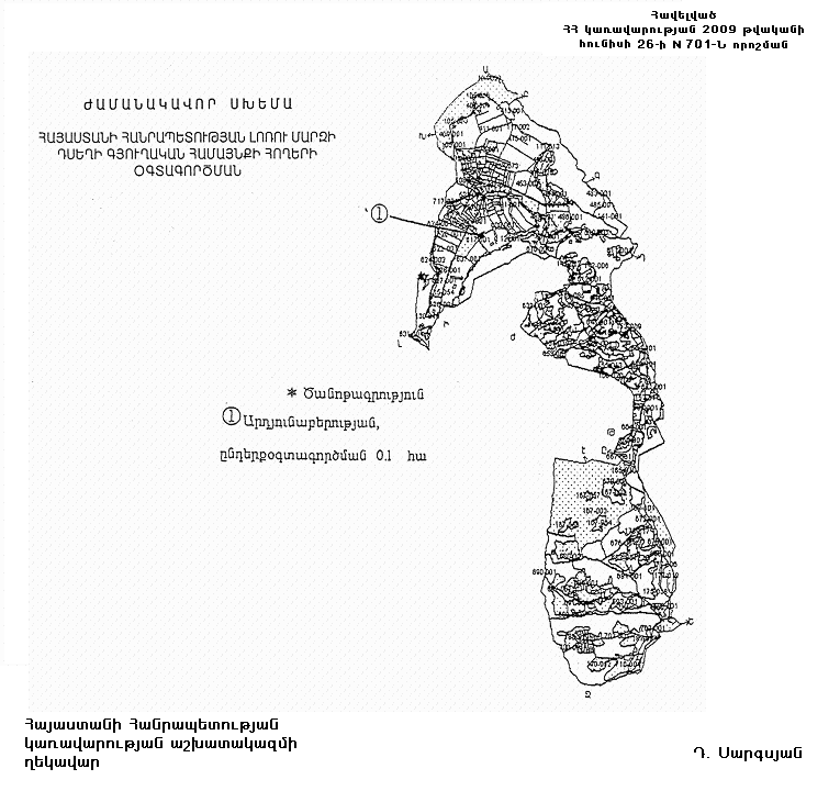1. Հայաստանի Հանրապետության կառավարության 2002 թվականի օգոստոսի 29-ի N 1341-Ն որոշմամբ հաստատված` Հայաստանի Հանրապետության Լոռու մարզի Դսեղի գյուղական համայնքի հողերի օգտագործման ժամանակավոր սխեմայում` համաձայն հավելվածի, քաղաքացիների սեփականությունը հանդիսացող` գյուղատնտեսական նշանակության 0.1 հեկտար վարելահողը փոխադրել արդյունաբերության, ընդերքօգտագործման և այլ արտադրական նշանակության հողերի կատեգորիա` քարի մշակման արտադրամաս կառուցելու համար: