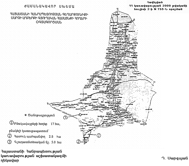 1) համայնքային սեփականություն հանդիսացող` գյուղատնտեսական նշանակության արոտավայրերից 17 հեկտարը փոխադրել բնակավայրերի հողերի կատեգորիա` բնակելի կառուցապատման համար, 2.5 հեկտարը` հատուկ պահպանվող տարածքների հողերի կատեգորիա` հանգստի գոտու կառուցապատման համար.