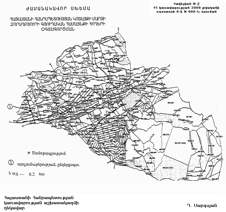 2) 0.2 հեկտարը` արդյունաբերության, ընդերքօգտագործման և այլ արտադրական նշանակության հողերի կատեգորիա` արդյունաբերական օբյեկտների կառուցման համար: