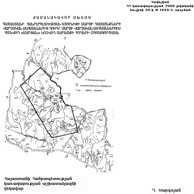 1. Հաստատել Հայաստանի Հանրապետության Սյունիքի մարզի համայնքների վարչական սահմաններից դուրս` մարզի վարչական սահմաններում գտնվող «Մարջան» կոչվող տարածքի հողերի օգտագործման ժամանակավոր սխեման` համաձայն հավելվածի, պետական սեփականություն հանդիսացող 1885.0 հեկտար հողերը, այդ թվում` գյուղատնտեսական նշանակության 1710.0 հեկտար արոտավայր, անտառային հողերից 175.0 հեկտար անտառ փոխադրել արդյունաբերության, ընդերքօգտագործման և այլ արտադրական նշանակության հողերի կատեգորիա` ընդերքօգտագործման նպատակով: