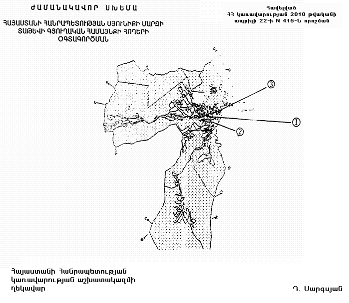 1. Հայաստանի Հանրապետության կառավարության 2008 թվականի հունվարի 31-ի N 75-Ն որոշմամբ հաստատված` Հայաստանի Հանրապետության Սյունիքի մարզի Տաթևի գյուղական համայնքի հողերի օգտագործման ժամանակավոր սխեմայում` համաձայն հավելվածի, փոխադրել`