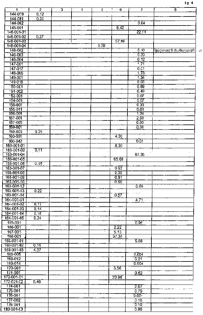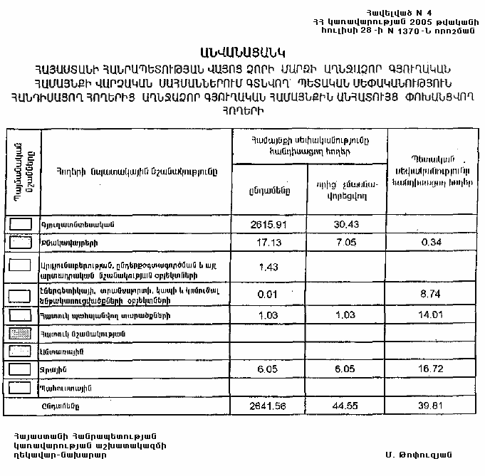 4. Ընդունել ի գիտություն Հայաստանի Հանրապետության Վայոց ձորի մարզի Աղնջաձորի գյուղական համայնքի հողային ֆոնդի առկայության և բաշխման մասին հաշվետվությունը՝ 2005 թվականի հունվարի 1-ի դրությամբ՝ համաձայն NN 8 և 9 հավելվածների: