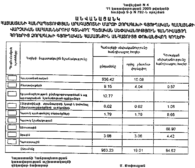 4. Ընդունել ի գիտություն Հայաստանի Հանրապետության Արագածոտնի մարզի Ձորագլխի գյուղական համայնքի հողային ֆոնդի առկայության և բաշխման մասին հաշվետվությունը՝ 2005 թվականի հունվարի 1-ի դրությամբ՝ համաձայն N 8 և 9 հավելվածների: