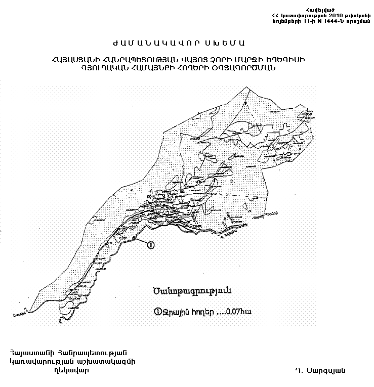 1. Հայաստանի Հանրապետության կառավարության 2004 թվականի մարտի 25-ի N 383-Ն որոշմամբ հաստատված` Հայաստանի Հանրապետության Վայոց ձորի մարզի Եղեգիսի գյուղական համայնքի հողերի օգտագործման ժամանակավոր սխեմայում` համաձայն հավելվածի, քաղաքացու սեփականությունը հանդիսացող՝ գյուղատնտեսական նշանակության 0.07 հեկտար այլ հողեր փոխադրել ջրային հողերի կատեգորիա` Հայաստանի Հանրապետության օրենսդրությամբ սահմանված կարգով ձկնատնտեսային կառույցի շինարարության և շահագործման համար: