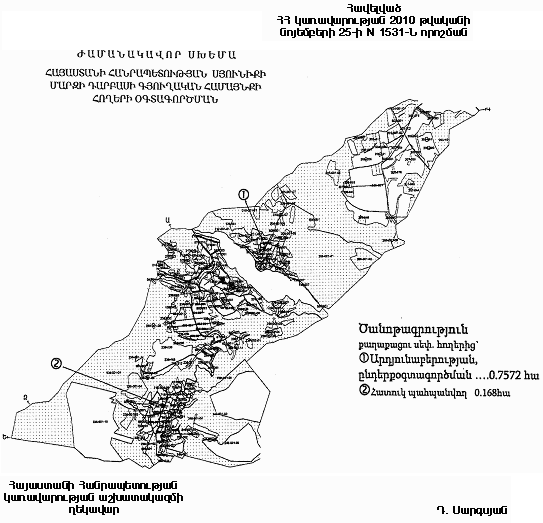 1) 0.7572 հեկտարը` արդյունաբերության, ընդերքօգտագործման և այլ արտադրական նշանակության օբյեկտների հողերի կատեգորիա` Հայաստանի Հանրապետության օրենսդրությամբ սահմանված կարգով հանքային ջրերի շշալցման գործարանի կառուցման և սպասարկման համար.