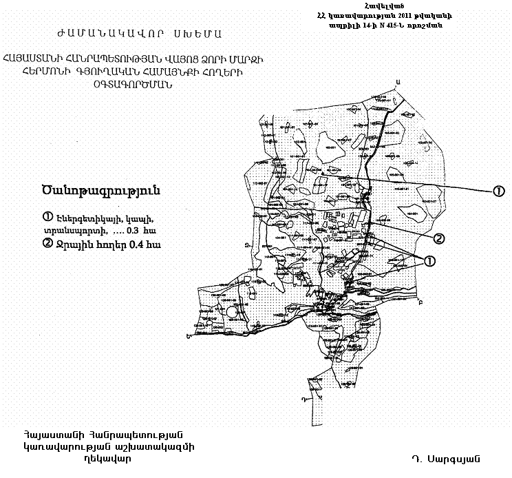1) 0.3 հեկտարը` էներգետիկայի, կապի, տրանսպորտի, կոմունալ ենթակառուցվածքների օբյեկտների հողերի կատեգորիա` Հայաստանի Հանրապետության օրենսդրությամբ սահմանված կարգով փոքր հիդրոէլեկտրակայանի և օժանդակ կառույցների շինարարության համար.