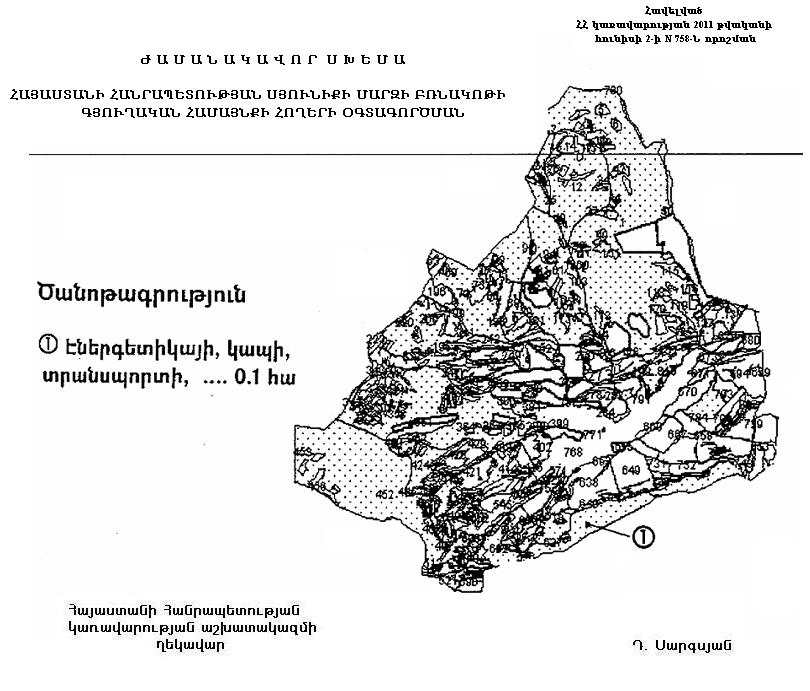 1. Հայաստանի Հանրապետության կառավարության 2002 թվականի մայիսի 30-ի N 699-Ն որոշմամբ հաստատված` Հայաստանի Հանրապետության Սյունիքի մարզի Բռնակոթի գյուղական համայնքի հողերի օգտագործման ժամանակավոր սխեմայում` համաձայն հավելվածի, համայնքային սեփականություն հանդիսացող` գյուղատնտեսական նշանակության արոտավայրերից 0.1 հեկտարը փոխադրել էներգետիկայի, կապի, տրանսպորտի, կոմունալ ենթակառուցվածքների օբյեկտների հողերի կատեգորիա` Հայաստանի Հանրապետության օրենսդրությամբ սահմանված կարգով փոքր հիդրոէլեկտրակայանի և օժանդակ կառույցների շինարարության համար:
