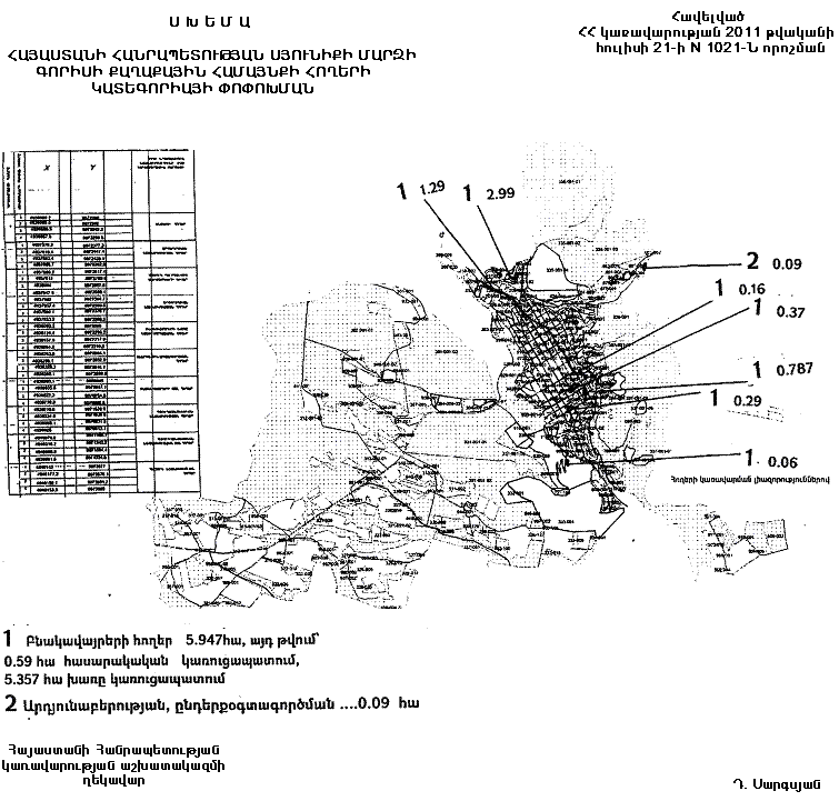1) համայնքային սեփականություն հանդիսացող 5.887 հեկտարը` բնակավայրերի հողերի կատեգորիա` Հայաստանի Հանրապետության օրենսդրությամբ սահմանված կարգով խառը և հասարակական կառուցապատման համար, այդ թվում՝