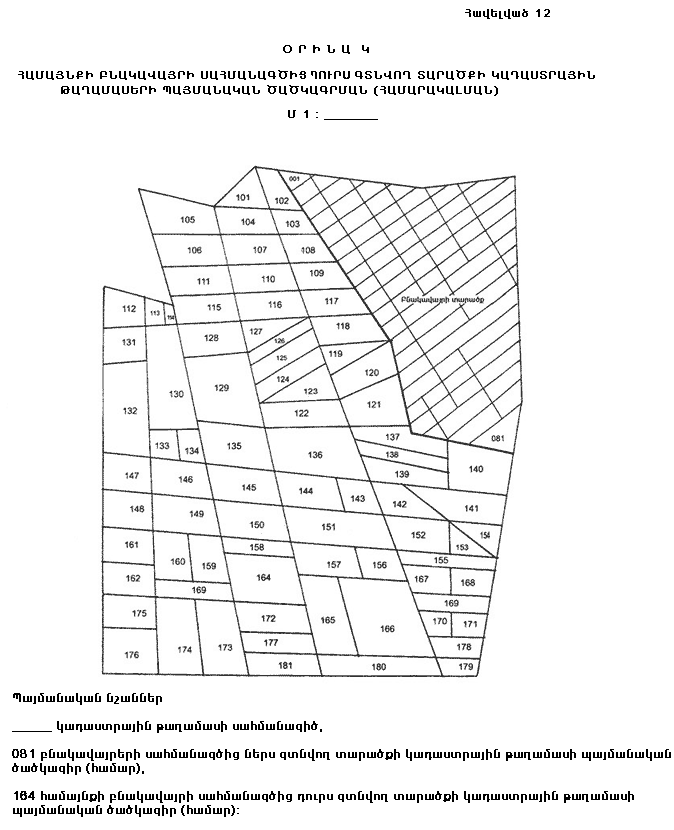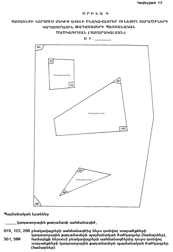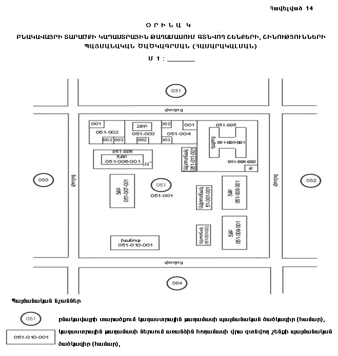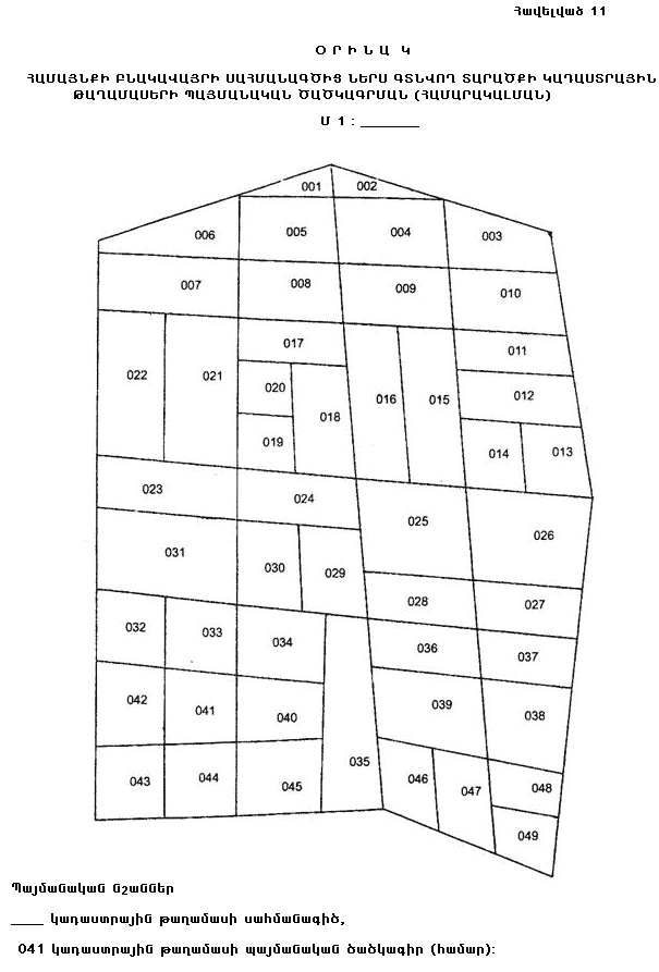 39. Հանութագրման աշխատանքին զուգահեռ կազմվում է տվյալ տարածքի ուրվանկարը (աբրիս), որի վրա պատկերվում են անշարժ գույքի միավորների սխեմատիկ տեղադրությունը, կոորդինատավորված կետերը, դրանց համարները և անհրաժեշտ այլ տվյալներ (հավելված 7):