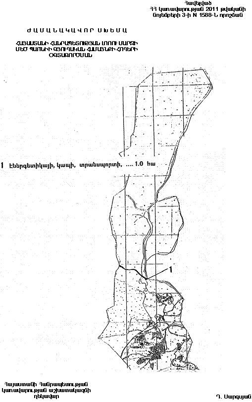 1. Հայաստանի Հանրապետության կառավարության 2002 թվականի սեպտեմբերի 19-ի N 1501-Ն որոշմամբ հաստատված` Հայաստանի Հանրապետության Լոռու մարզի Մեծ Պառնիի գյուղական համայնքի հողերի օգտագործման ժամանակավոր սխեմայում՝ համաձայն հավելվածի, պետական սեփականություն հանդիսացող` էներգետիկայի, տրանսպորտի, կապի և կոմունալ ենթակառուցվածքների օբյեկտների նշանակության մեկ հեկտար հողամասը («Թռչկան» հանդամաս` հատկացված «Թռչկան» ջրվեժի տարածքում կառուցվող փոքր հիդրոէլեկտրակայանի համար) փոխադրել հատուկ պահպանվող տարածքների կատեգորիա` բնապահպանական գործառնական նշանակությամբ: