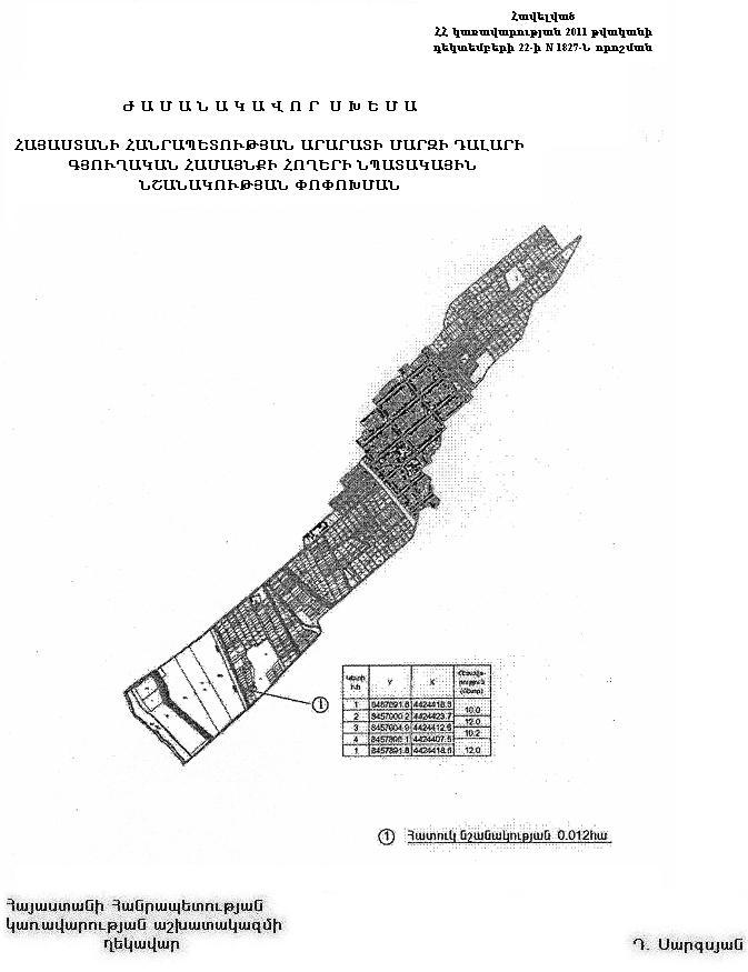 1. Հայաստանի Հանրապետության կառավարության 2003 թվականի սեպտեմբերի 11-ի N 1160-Ն որոշմամբ հաստատված` Հայաստանի Հանրապետության Արարատի մարզի Դալարի գյուղական համայնքի հողերի օգտագործման ժամանակավոր սխեմայում` համաձայն հավելվածի, համայնքային սեփականություն հանդիսացող` գյուղատնտեսական նշանակության այլ հողերից 0.012 հեկտարը փոխադրել հատուկ նշանակության հողերի կատեգորիա` Հայաստանի Հանրապետության օրենսդրությամբ սահմանված կարգով հակակարկտային գեներատորային կայանների կառուցման համար:
