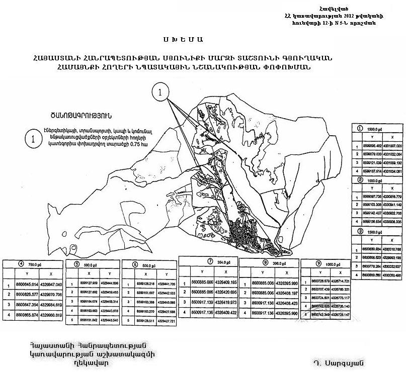 1. Հայաստանի Հանրապետության կառավարության 2004 թվականի մարտի 4-ի N 260-Ն որոշմամբ հաստատված` Հայաստանի Հանրապետության Սյունիքի մարզի Տաշտունի գյուղական համայնքի հողերի օգտագործման ժամանակավոր սխեմայում` համաձայն հավելվածի, 0.75 հեկտար հողերը փոխադրել էներգետիկայի, կապի, տրանսպորտի, կոմունալ ենթակառուցվածքների օբյեկտների հողերի կատեգորիա` Հայաստանի Հանրապետության օրենսդրությամբ սահմանված կարգով փոքր հիդրոէլեկտրակայանների և օժանդակ կառույցների շինարարության համար, այդ թվում` պետական սեփականություն հանդիսացող անտառային հողերից` 0.0396 հեկտար, հատուկ պահպանվող տարածքների հողերից` 0.575 հեկտար, համայնքային սեփականություն հանդիսացող` գյուղատնտեսական նշանակության հողերից` 0.1354 հեկտար, որից` 0.1 հեկտար արոտավայր, 0.0354 հեկտար այլ հողատեսք: